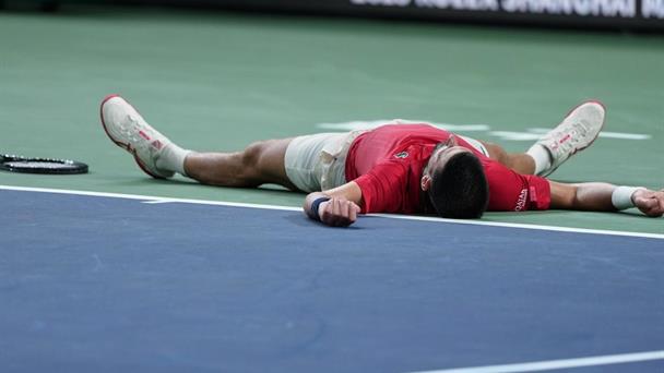 El serbio Novak Djokovic se desploma tras perder un punto ante el español Jaume Munar, en el Masters de Shanghái.