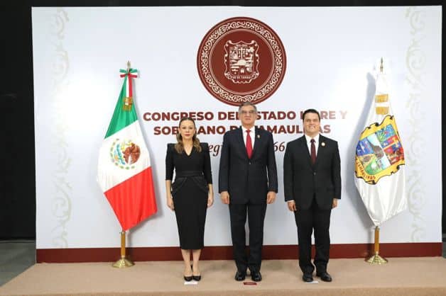 Esta transformación fue posible gracias al liderazgo del Gobernador, señaló el presidente del Congreso, Humberto Prieto Herrera, al centro, flanqueado por Tania Gisela Contreras López y Américo Villarreal Anaya.