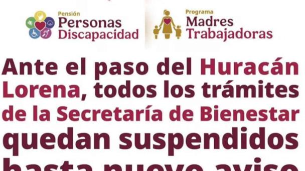 Debido al paso del huracán "Lorena", la Secretaría del Bienestar suspendió sus actividades en Baja California Sur y Sonora hasta nuevo aviso.