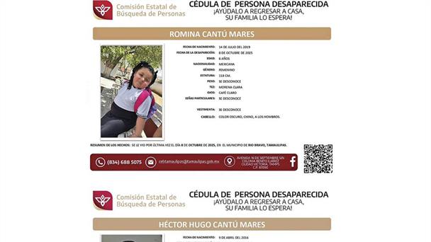 "La Comisión Estatal de Búsqueda de Personas Tamaulipas solicita el apoyo de la ciudadanía para localizar a los menores Romina Cantú Mares (6 años) y Héctor Hugo Cantú Mares (9 años).