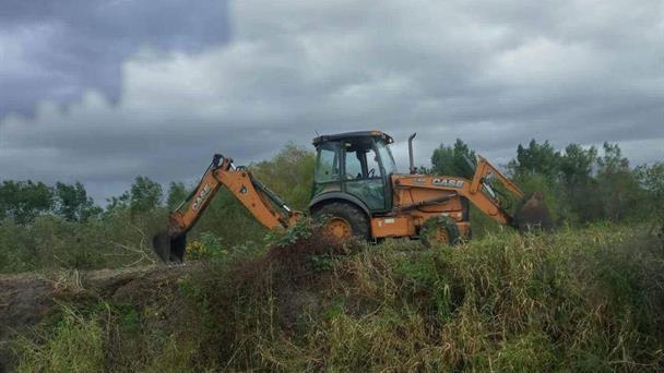 La máquina retroexcavadora que operaba quedó abandonada durante varias horas a un costado del bordo del canal debido al riesgo que representaba la presencia del enjambre.