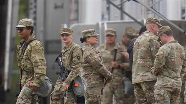 Personal militar uniformado, con el parche de la Guardia Nacional de Texas, en el Centro de Reserva del Ejército de Estados Unidos, en Elwood, Illinois.
