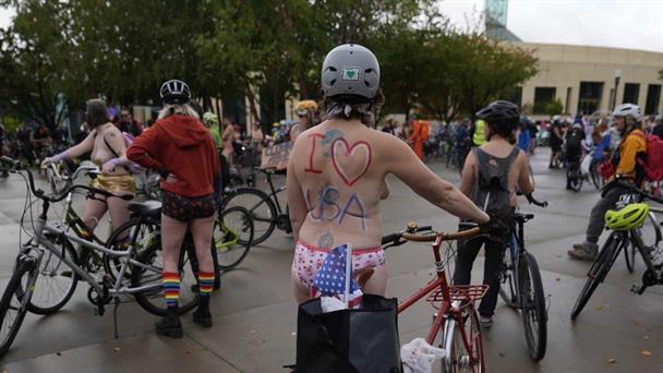 Manifestantes participan en el Paseo Desnudo en Bicicleta, el domingo 12 de octubre de 2025, en Portland, Oregon.