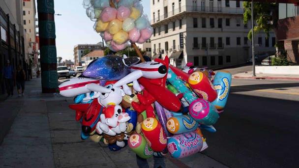 Un vendedor ambulante lleva algodón de azúcar y juguetes inflables cerca del parque MacArthur, un área blanco de recientes redadas migratorias del Servicio de Inmigración y Control de Aduanas (ICE, por sus siglas en inglés), en Los Ángeles.