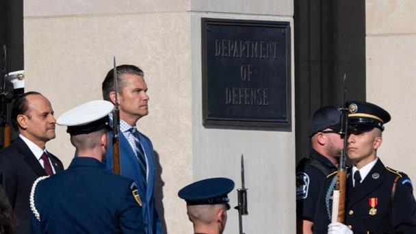El secretario de Defensa de EEUU, Pete Hegseth, da la bienvenida al ministro de Defensa de Qatar, el jeque Saoud Al Thani, a la izquierda, al Pentágono