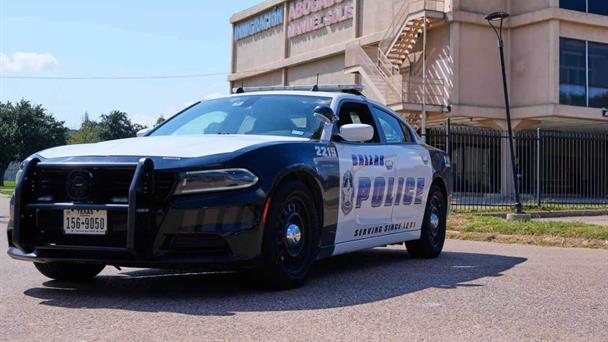 Un vehículo policial bloquea el paso cerca de una escena donde se cometió un delito junto a una oficina del Servicio de Inmigración y Control de Aduanas (ICE, por sus siglas en inglés), el jueves 25 de septiembre de 2025, en Dallas.