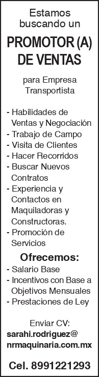 estamos buscando un *promotor (a) de ventas para empresa transportista -habilidades de ventas y negociacion -trabajo de campo -visita de clientes -hacer recorridos -buscar nuevos contratos -experiencia y contactos en maquiladoras y constructoras. promocion de servicios ofrecemos: -salario base -incentivos con base a objetivos mensuales -prestaciones de ley enviar cv: sarahi.rodriguez@nrmaquinaria.com.mx cel. 8991221293