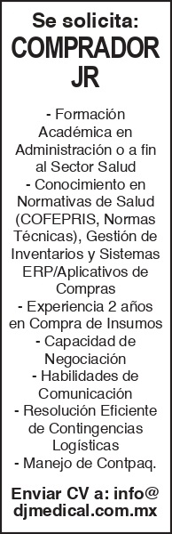 se solicita: *comprador jr -formacion academica en administracion o a fin al sector salud -conocimiento en normativas de salud (cofepris, normas tecnicas), gestion de inventarios y sistemas erp/aplicativos de compras -experiencia 2 años en compra de insumos -capacidad de negociacion -habilidades de comunicacion -resolucion eficiente de contingencias logisticas -manejo de contpaq. enviar cv a: info@djmedical.com.mx