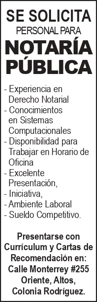 *se solicita personal para notaria publica. -experiencia en derecho notarial -conocimientos en sistemas computacionales -disponibilidad para trabajar en horario de oficina -excelente presentacion, iniciativa, ambiente laboral -sueldo competitivo. presentarse con curriculum y cartas de recomendacion en: calle monterrey #255 oriente, altos, colonia rodriguez.