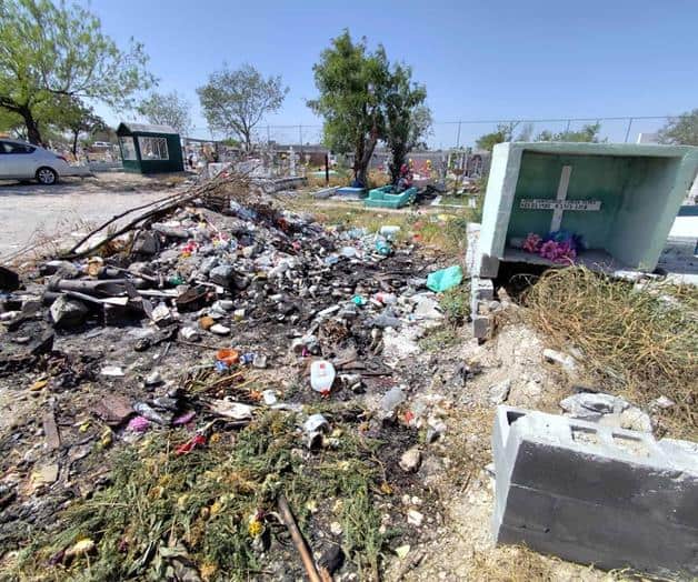 Durante un recorrido por el lugar se observaron latas de cerveza, restos de floreros, ramos artificiales en desuso y cruces tiradas entre las tumbas y decenas de basureros clandestinos al fondo de la calle principal, lo que evidencia la falta de mantenimiento en uno de los panteones más antiguos de la ciudad.