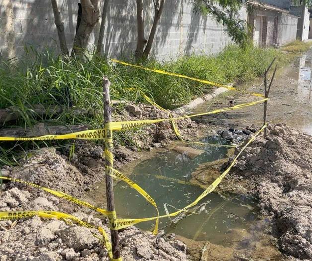 Un amplio socavón permanece visible sobre la privada Santa Cecilia, en la colonia Prado Sur de Reynosa, luego de que personal de la Comisión Municipal de Agua Potable y Alcantarillado (COMAPA) realizara trabajos de reparación para atender una fuga de agua potable en el sector.